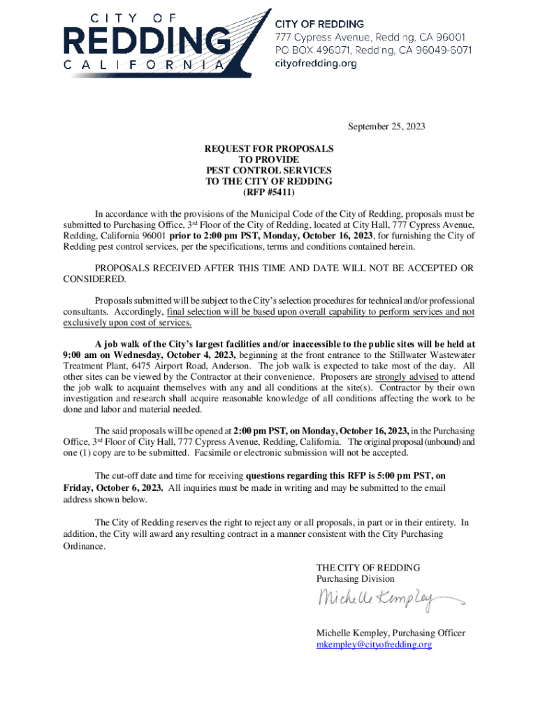 September 25, 2023, REQUEST FOR PROPOSALS TO PROVIDE PEST CONTROL SERVICES TO THE CITY OF REDDING (RFP #5411) In accordance with the provisions of the Municipal Code of the City of Redding, proposals