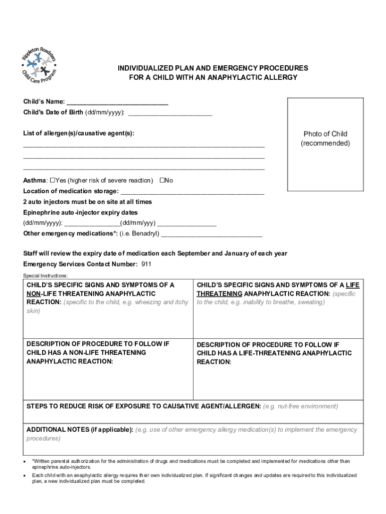 INDIVIDUALIZED PLAN AND EMERGENCY PROCEDURES FOR A CHILD WITH AN ANAPHYLACTIC ALLERGY Child's Name: ___ Child\'s Date of Birth (dd/mm/YYY): ___ List of allergen(s)/causative agent(s): ___Photo of