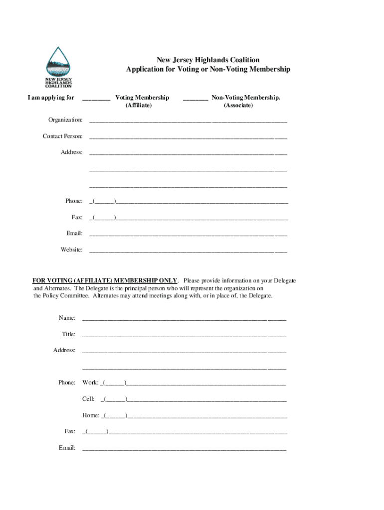 New Jersey Highlands Coalition Application for Voting or Nonvoting Membership am I applying for___ Voting Membership (Affiliate)___ Nonvoting Membership. (Associate)Organization:___Contact Person:___Address:___