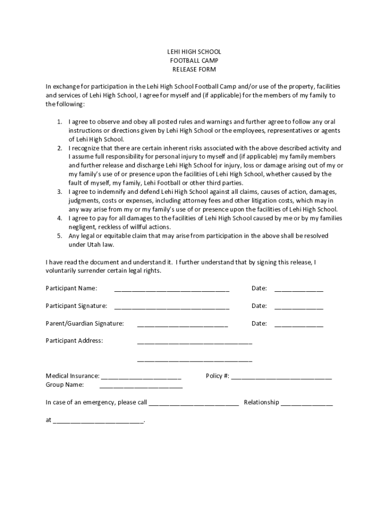 LEVI HIGH SCHOOLFOOTBALL CAMPRELEASE Forming exchange for participation in the Levi High School Football Camp and/or use of the property, facilities and services of Levi High School, I agree for myself