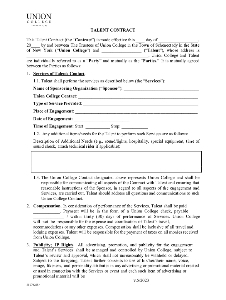 TALENT CONTRACT This Talent Contract (the Contract) is made effective this ___ day of ___, 20___ by and between The Trustees of Union College in the Town of Schenectady in the State of New York (Union