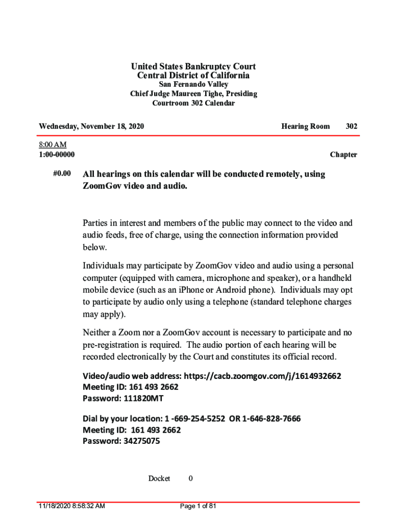 United States Bankruptcy Court Central District of California San Fernando Valley Chief Judge Maureen Life, Presiding Courtroom 302 Calendar Wednesday, November 18, 2020 8:00 AM 1:0000000 #0.00302Hearing