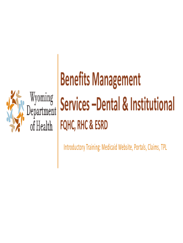 Benefits Management Services Dental & Institutional FHC, RHC & ESD Introductory Training: Medicaid Website, Portals, Claims, Telecourse Content Introducing ANSI Moving Forward with WINGS Scope of