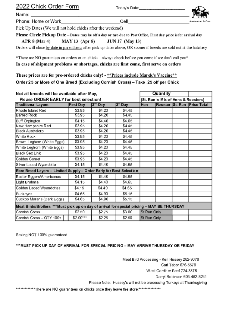2022 Chick Order Formosa\'s Date:___Name: ___ Phone: Home or Work___Cell___ Pick Up Dates (We will not hold chicks after the weekend) Please Circle Pickup Date Dates may be off a day or two due to
