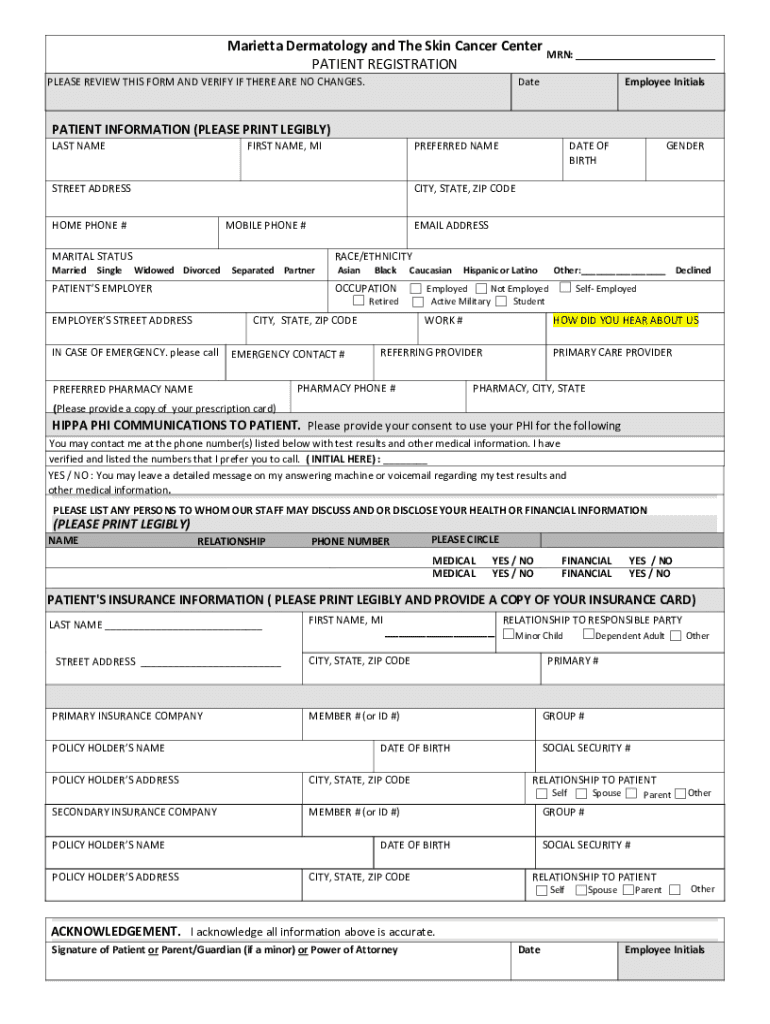 Marietta Dermatology and The Skin Cancer Center MAN: ___ PATIENT REGISTRATIONPATIENT INFORMATION (PLEASE PRINT LEGIBLY) LAST NAMEFIRST NAME, PREFERRED BACKSTREET ADDRESSMarriedSingleDATE OF BIRTHGENDERCITY,