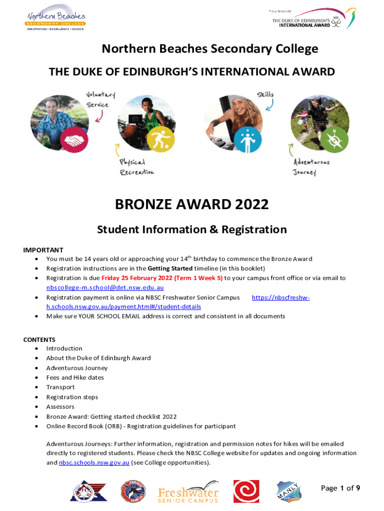Northern Beaches Secondary College THE DUKE OF EDINBURGH INTERNATIONAL AWARDBRONZE AWARD 2022 Student Information & Registration IMPORTANT You must be 14 years old or approaching your 14th birthday