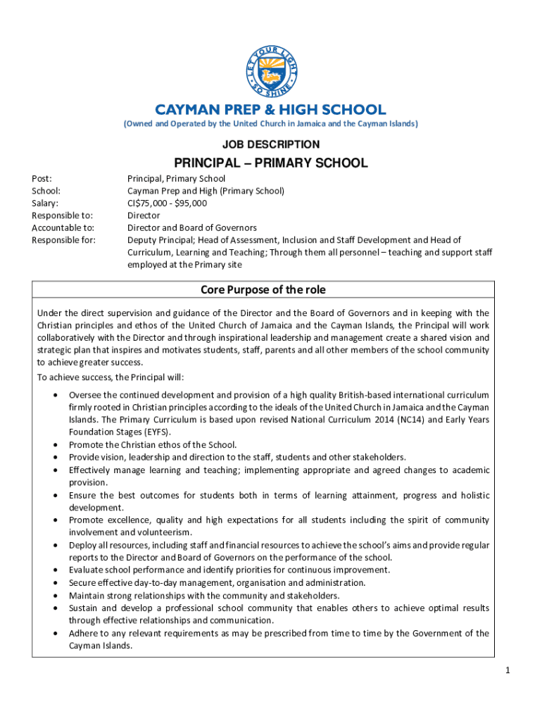 (Owned and Operated by the United Church in Jamaica and the Cayman Islands)JOB DESCRIPTIONPRINCIPAL PRIMARY SCHOOL Post: School: Salary: Responsible to: Accountable to: Responsible for:Principal,