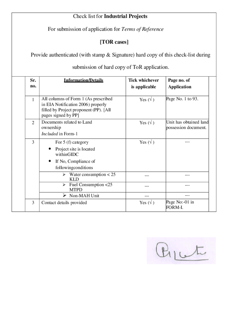 Check list for Industrial Projects For submission of application for Terms of Reference [TOR cases] Provide authenticated (with stamp & Signature) hard copy of this checklist during submission of