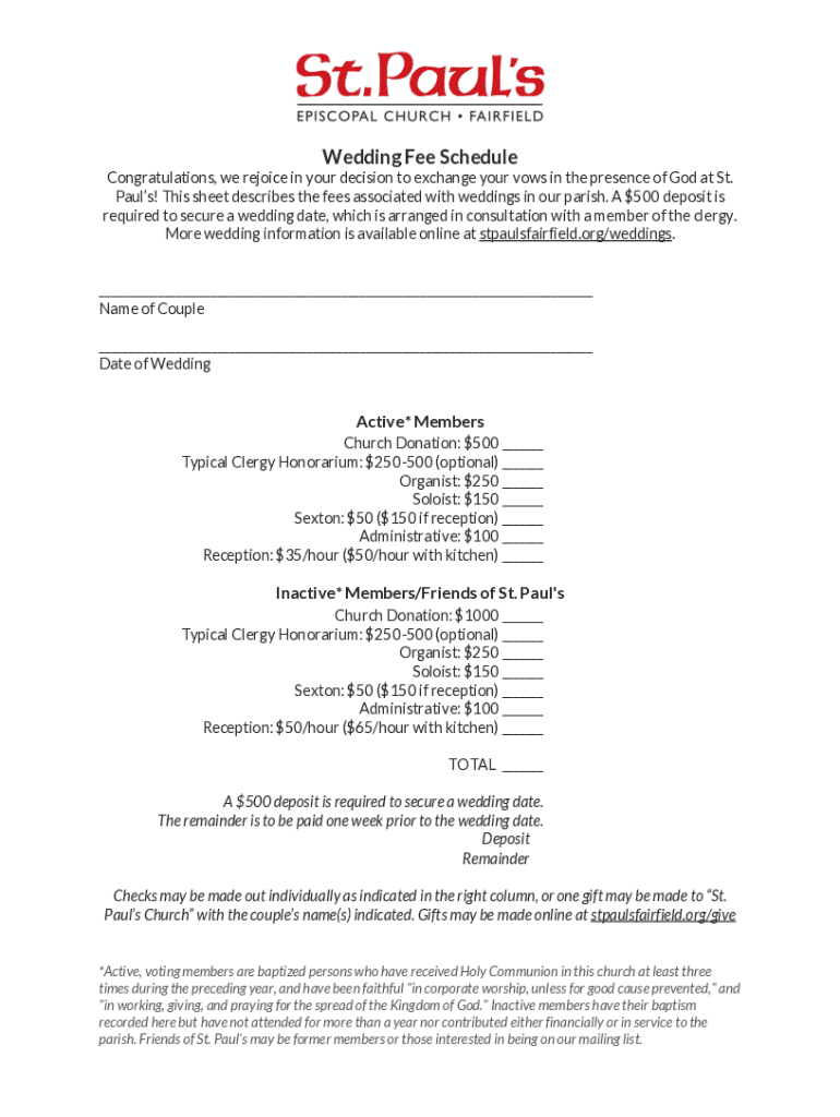 Wedding Fee ScheduleCongratulations, we rejoice in your decision to exchange your vows in the presence of God at St. Paul's! This sheet describes the fees associated with weddings in our parish. A