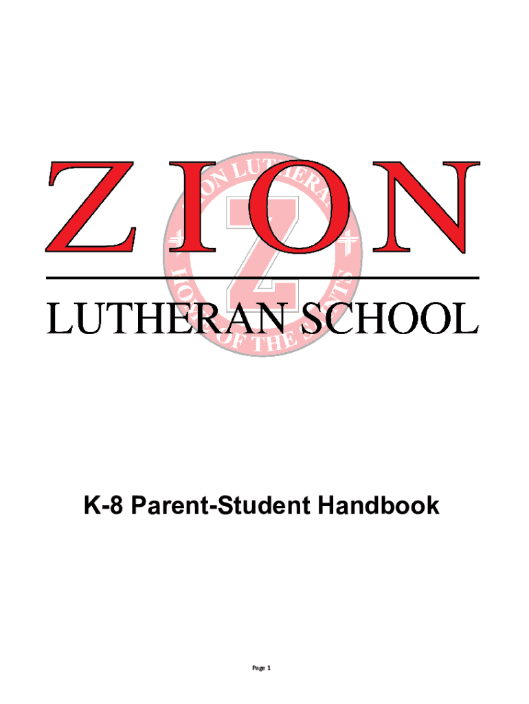 K8 ParentStudent Handbook Page 1ZION LUTHERAN SCHOOL MISSION STATEMENT At Zion, Gods love works in and through His people. In a nurturing environment and through academic excellence children grow