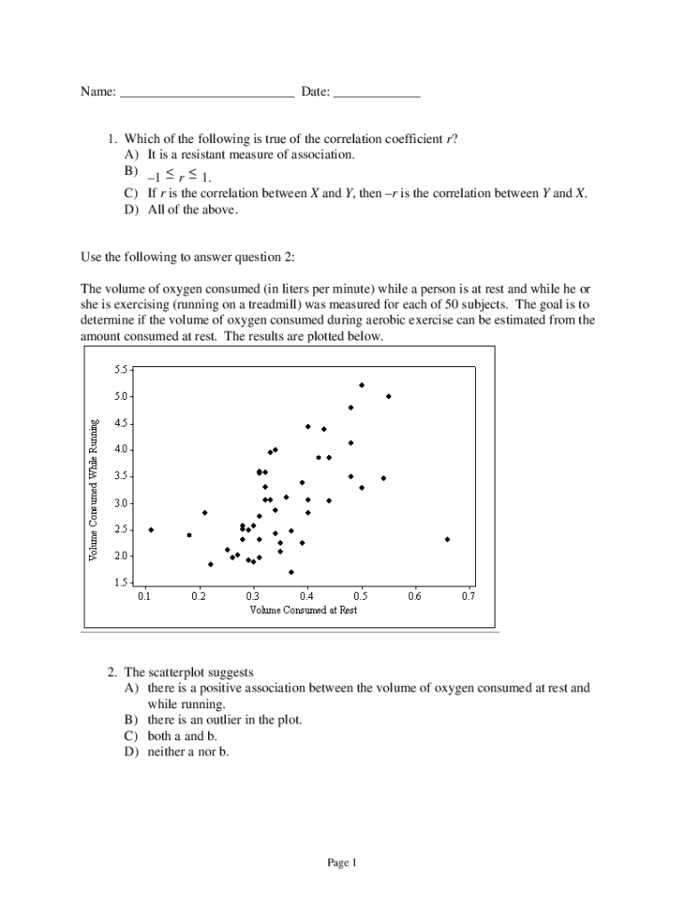 Name: ___ Date: ___1. Which of the following is true of the correlation coefficient r? A) It is a resistant measure of association. B) 1 r 1. C) If r is the correlation between X and Y, then r is