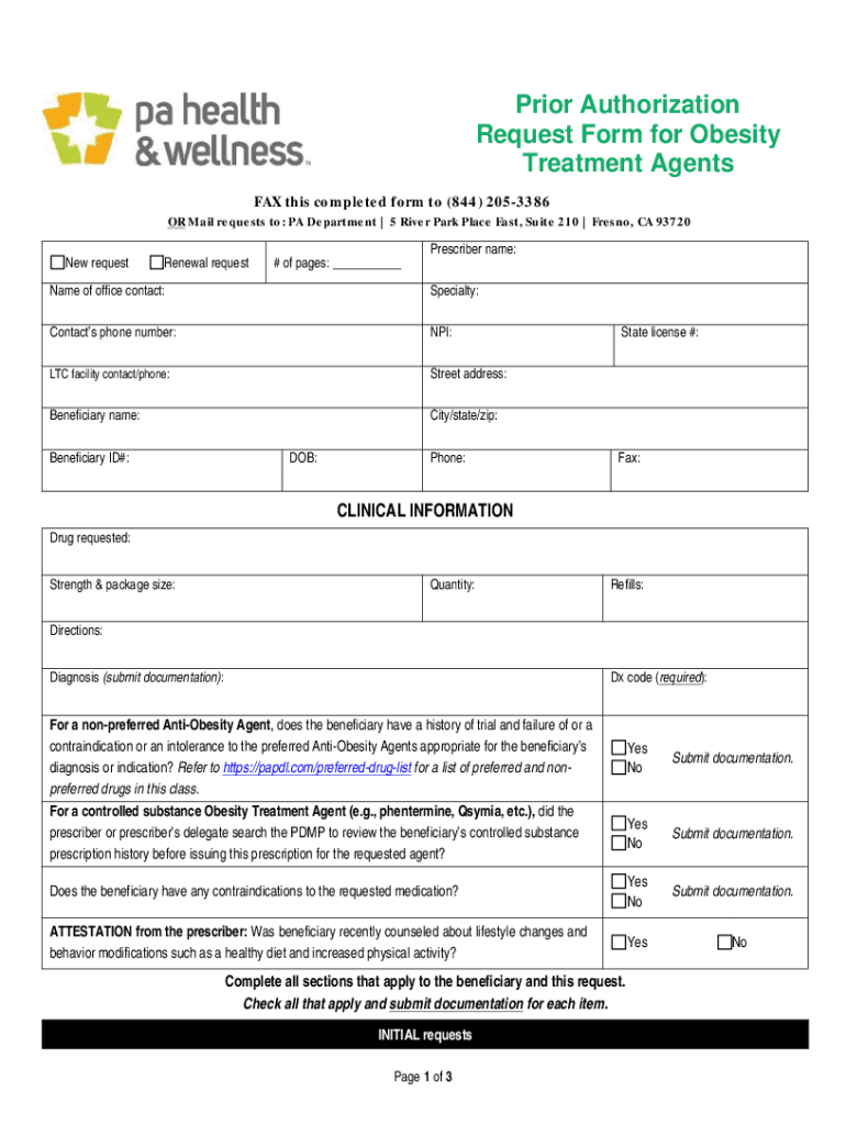 Prior Authorization Request Form for Obesity Treatment Agents FAX this completed form to (844) 2053386OR Mail requests to: PA Department | 5 River Park Place East, Suite 210 | Fresno, CA 93720 New