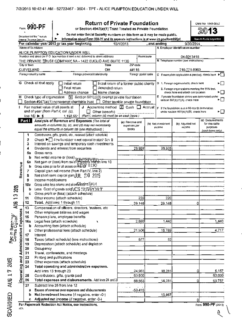 7/2/2015 10:43:41 AM 52723467 3504 TPT ALICE LIPTON EDUCATION UNDER WILLForm990PFe Treasury