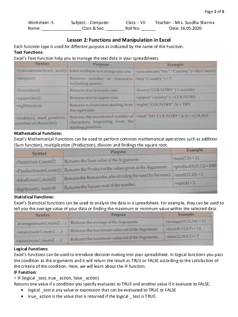 Page 1 of 5Worksheet 5 Subject: Computer Class: VII Teacher: Mrs. Buddha Sharma Name: ___ Class & Sec: ___ Roll No. ___ Date: 16.05.2020Lesson 2: Functions and Manipulation in Excel Each function