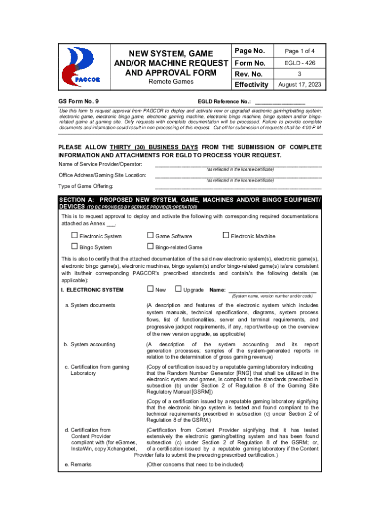 Page No. NEW SYSTEM, GAME AND/OR MACHINE REQUEST Form No. AND APPROVAL FORM Rev. No. Remote GamesEffectivityPage 1 of 4 EGAD 426 3 August 17, 2023GS Form No. 9EGLD Reference No.: ___Use this form