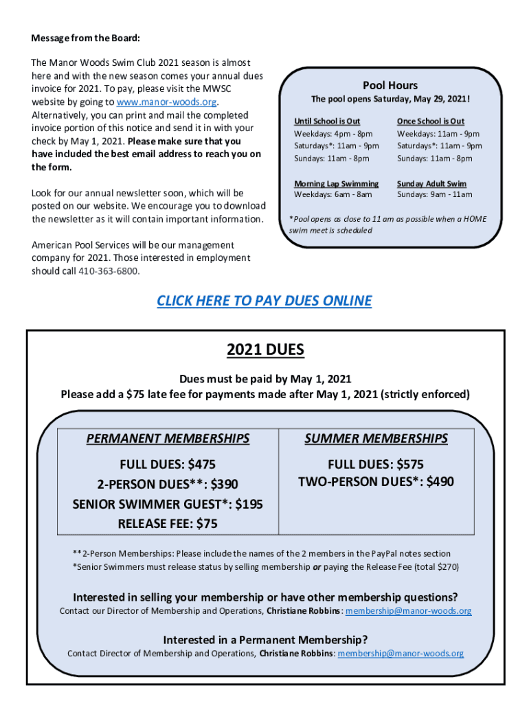 Message from the Board: The Manor Woods Swim Club 2021 season is almost here and with the new season comes your annual dues invoice for 2021. To pay, please visit the MSC website by going to www.manorwoods.org.