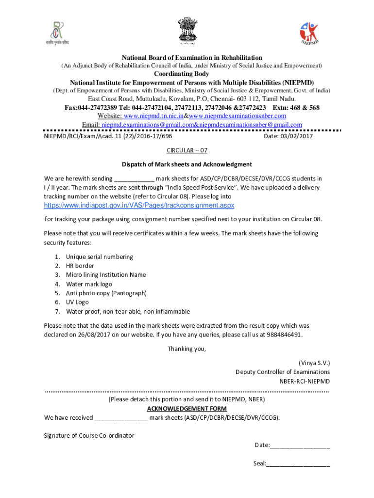 National Board of Examination in Rehabilitation (An Adjunct Body of Rehabilitation Council of India, under Ministry of Social Justice and Empowerment)Coordinating Body National Institute for Empowerment