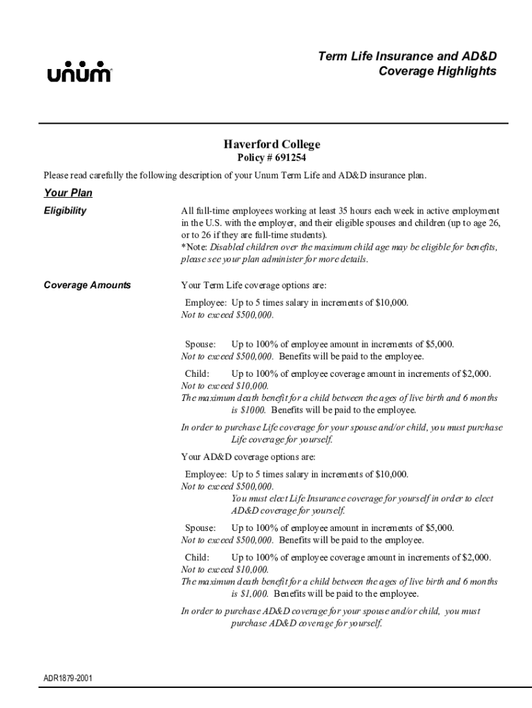 Term Life Insurance and ADD Coverage HighlightsHaverford College Policy # 691254 Please read carefully the following description of your UNM Term Life and ADD insurance plan. Your Plan Eligibility