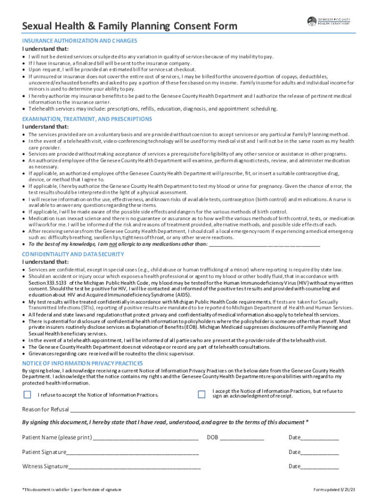 Sexual Health & Family Planning Consent Form INSURANCE AUTHORIZATION AND CHARGES I understand that: I will not be denied services or subjected to any variation in quality of services because of my