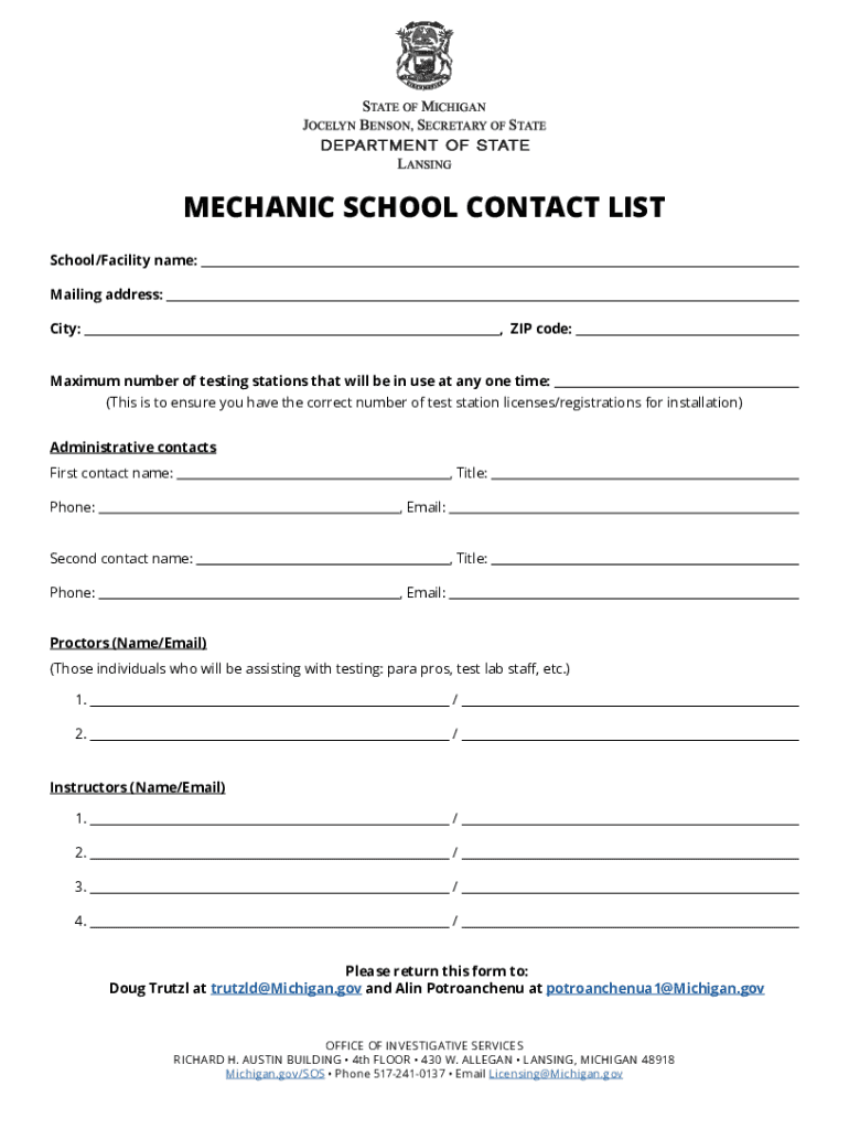 CLEAR FORMMECHANIC SCHOOL CONTACT LIST School/Facility name: Mailing address: City:, ZIP code:Maximum number of testing stations that will be in use at any one time: (This is to ensure you have the