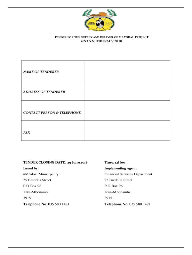 TENDER FOR THE SUPPLY AND DELIVER OF MAYORAL PROJECT BID NO. HBO/613/ 2018NAME OF TENDERERADDRESS OF TENDERERCONTACT PERSON & TELEPHONEFAXTENDER CLOSING DATE: 29 June 2018Time: 12H00Issued by:Implementing