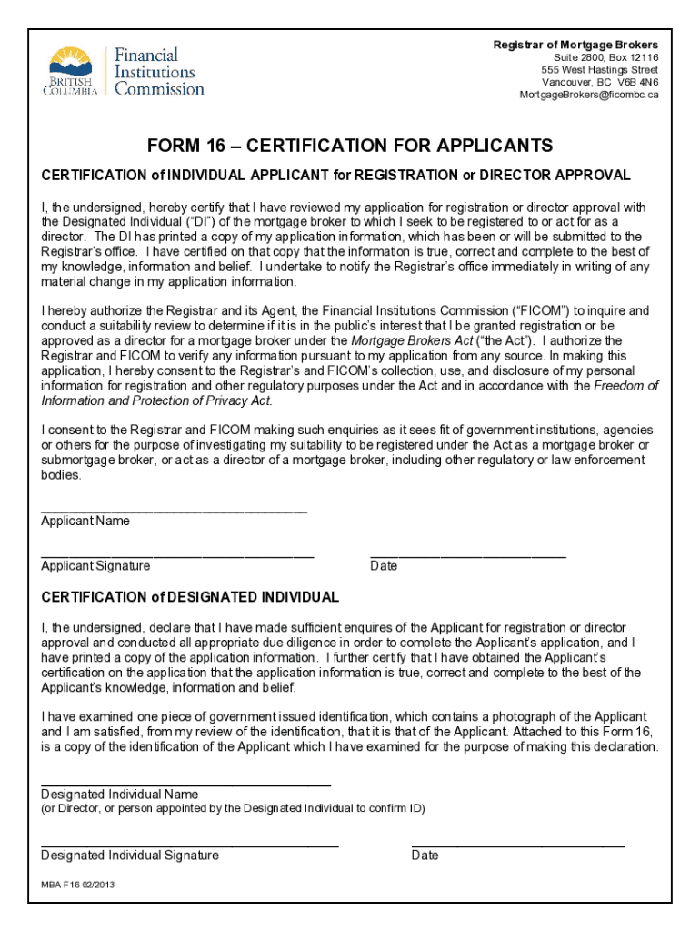 Registrar of Mortgage Brokers Suite 2800, Box 12116 555 West Hastings Street Vancouver, BC V6B 4N6 MortgageBrokers@ficombc.caFORM 16 CERTIFICATION FOR APPLICANTS CERTIFICATION of INDIVIDUAL APPLICANT