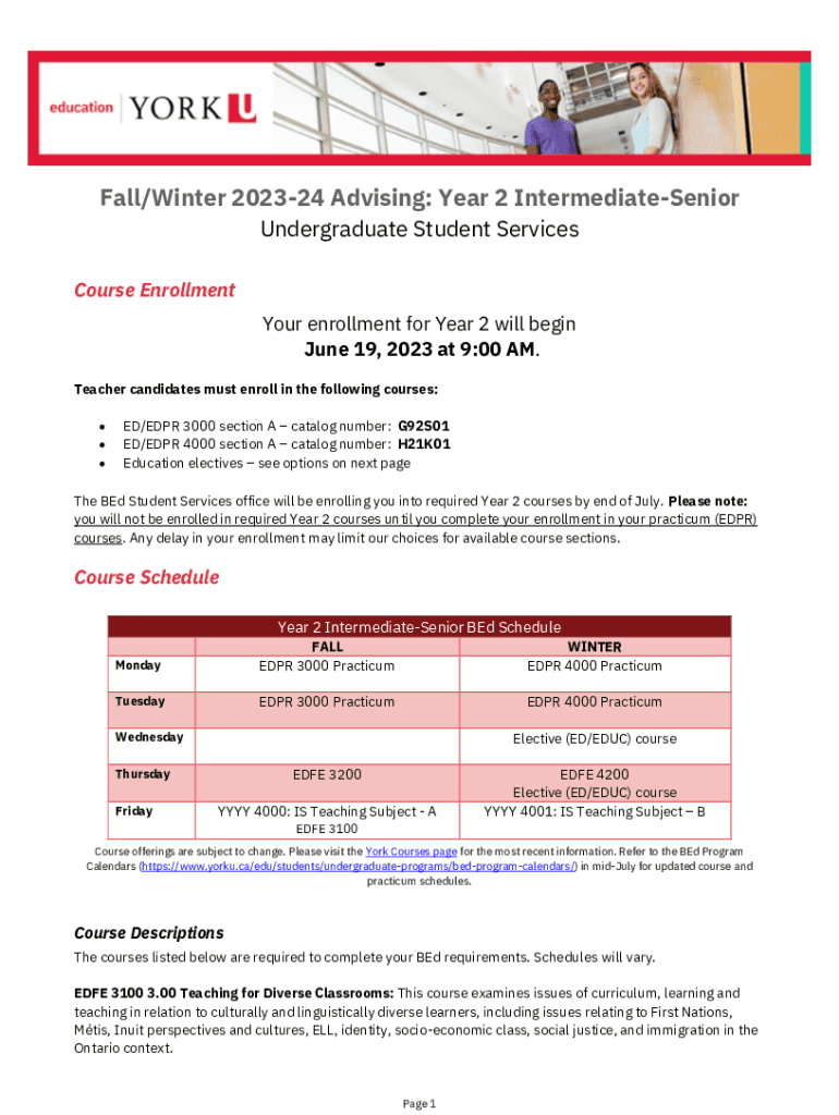 Fall/Winter 202324 Advising: Year 2 Intermediate Senior Undergraduate Student Services Course Enrollment Your enrollment for Year 2 will begin June 19, 2023, at 9:00 AM. Teacher candidates must enroll