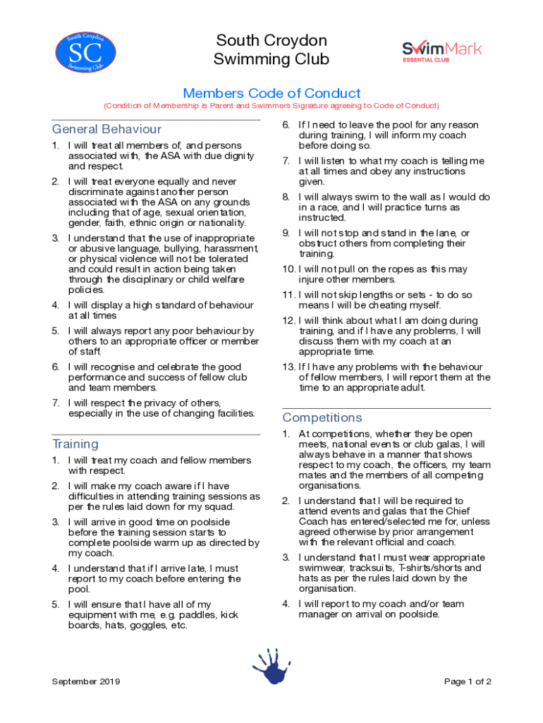 South CroydonSwimming Clubbers Code of Conduct(Condition of Membership is Parent and Swimmers Signature agreeing to Code of Conduct)General Behaviour1. I will treat all members of, and persons associated