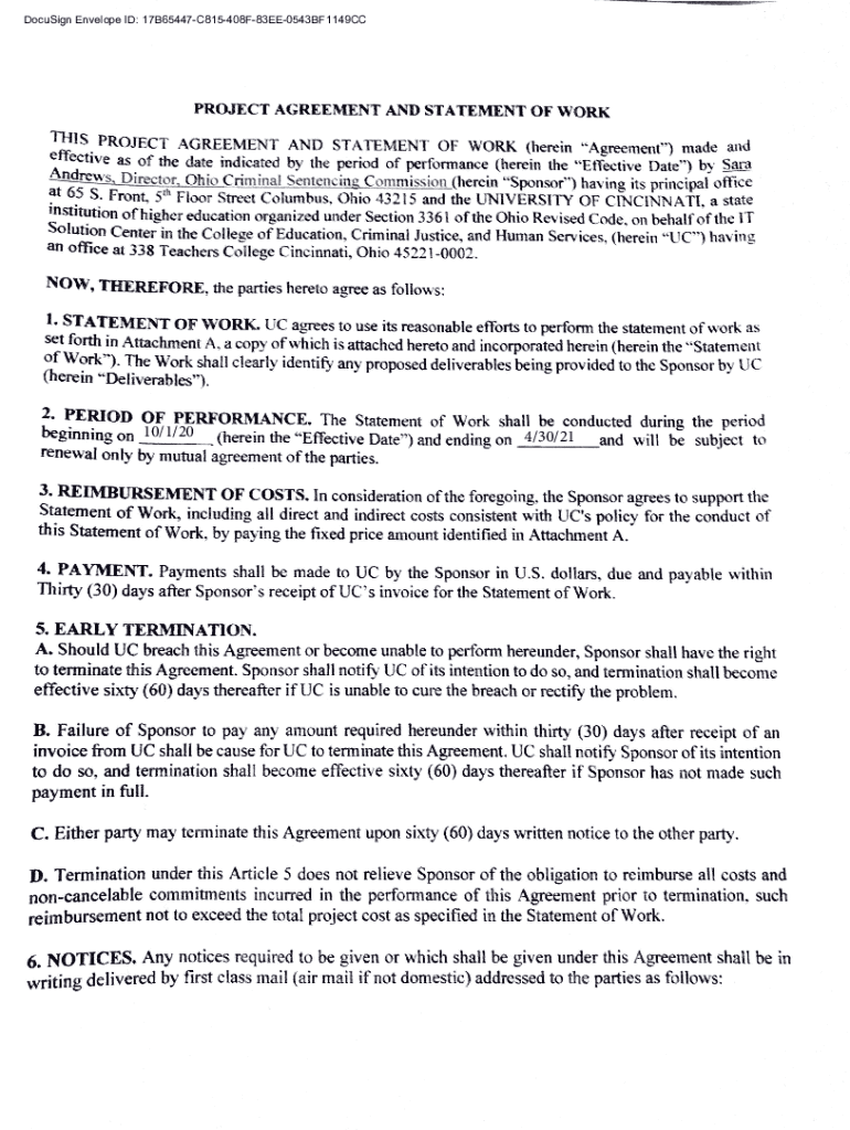 DocuSign Envelope ID: 17B65447C815408F83EE0543BF1149CC F9EFE6C1D89D4E07AE03737A6464FBE0PROJECT AGREEMENT AND STATEMENT OF Working_ PROJECTAGREEMENT AND STATEMENT OF WORK (herein \” Agreement\”\”)