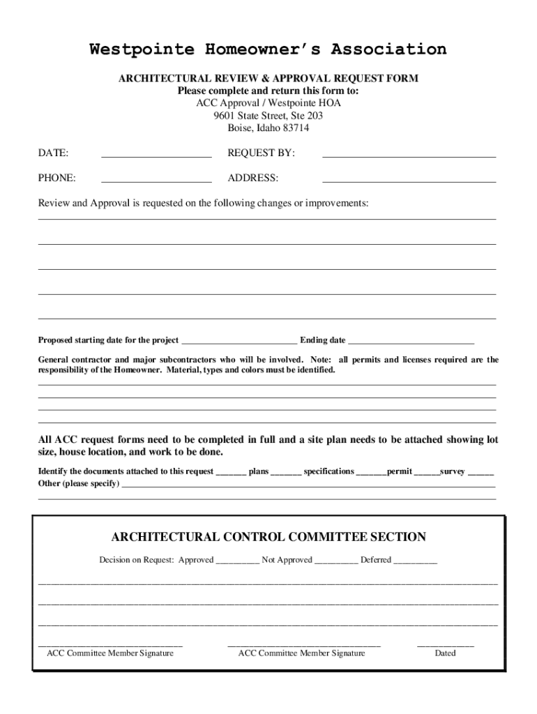 Eastpointe Homeowners Association ARCHITECTURAL REVIEW & APPROVAL REQUEST FORM Please complete and return this form to: ACC Approval / Eastpointe HOA 9601 State Street, Ste 203 Boise, Idaho 83714