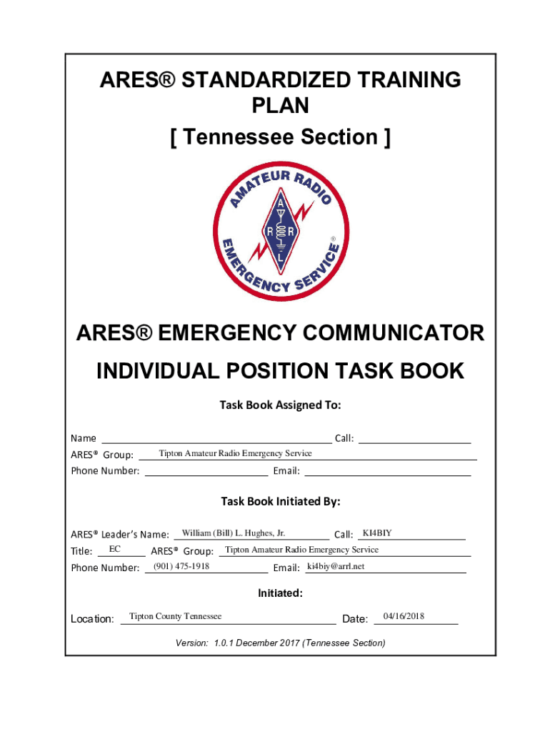 ARES STANDARDIZED TRAINING PLAN [Tennessee Section]ARES EMERGENCY COMMUNICATOR INDIVIDUAL POSITION TASK BOOK Assigned To: Name ___ Call: ___ Lipton Amateur Radio Emergency Service ARES Group: ___
