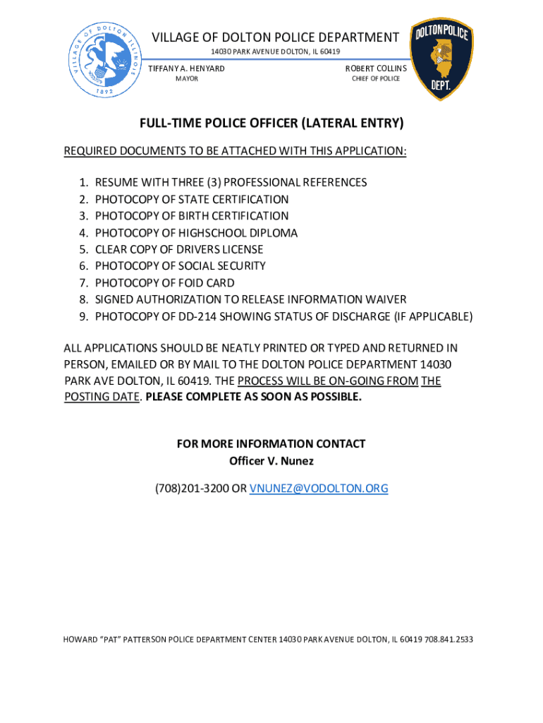 VILLAGE OF BOLTON POLICE DEPARTMENT 14030 PARK AVENUE BOLTON, IL 60419TIFFANY A. HENYARDROBERT COLLINSMAYORCHIEF OF POLICEFULLTIME POLICE OFFICER (LATERAL ENTRY) REQUIRED DOCUMENTS TO BE ATTACHED
