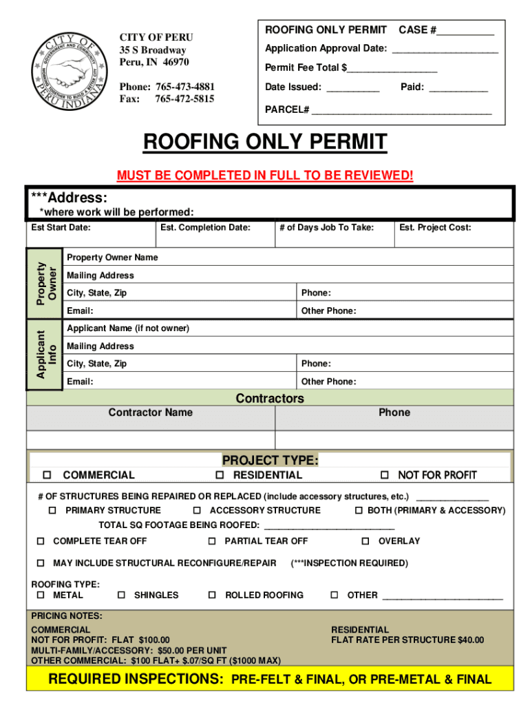 ROOFING ONLY PERMITTING OF PERU 35 S Broadway Peru, IN 46970CASE #___Application Approval Date: ___ Permit Fee Total $___Phone: 7654734881 Fax: 7654725815Date Issued: ___Paid: ___PARCEL# ___ROOFING