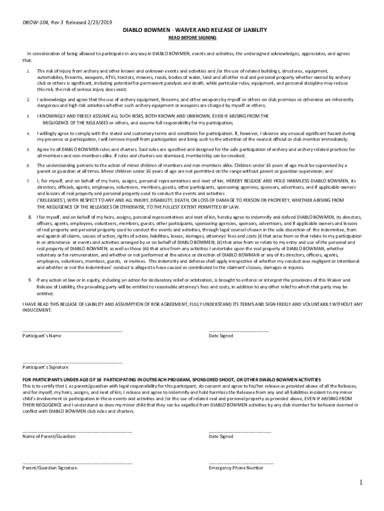 DBOW104, Rev 3 Released 2/23/2019DIABLO BOWMEN WAIVER AND RELEASE OF LIABILITY READ BEFORE SIGNING In consideration of being allowed to participate in any way in DIABLO BOWMEN, events and activities,