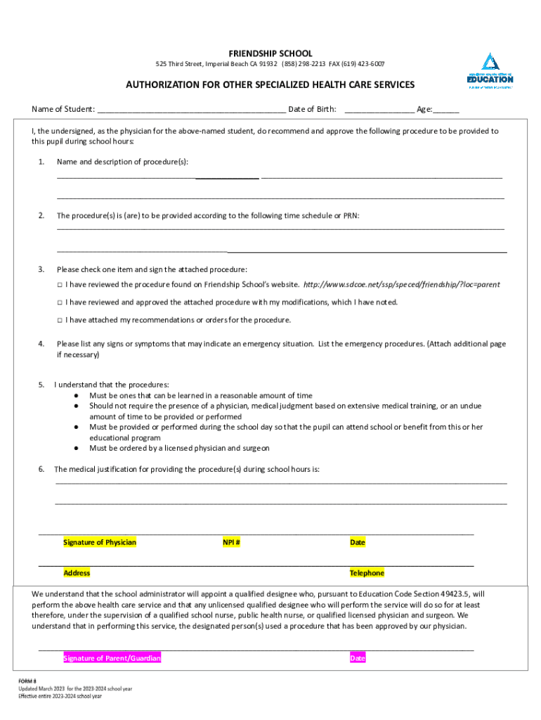 FRIENDSHIP SCHOOL 525 Third Street, Imperial Beach CA 91932 (858) 2982213 FAX (619) 4236007AUTHORIZATION FOR OTHER SPECIALIZED HEALTH CARE SERVICES Name of Student: ___ Date of Birth: ___ Age:___
