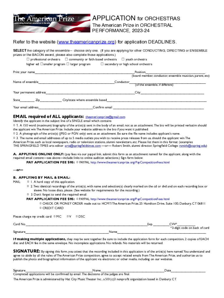 The American Prize in ORCHESTRAL PERFORMANCE, 202324 Refer to the website (www.theamericanprize.org) for application DEADLINES. SELECT the category of the ensemble choose only one. (If you are applying