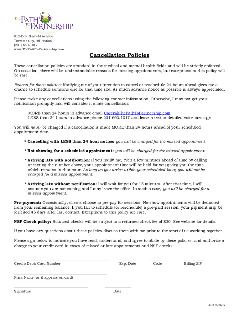 812D S. Garfield Avenue Traverse City, MI 49686 (231) 6601017 www.ThePathToPartnership.comCancellation Policies These cancellation policies are standard in the medical and mental health fields and