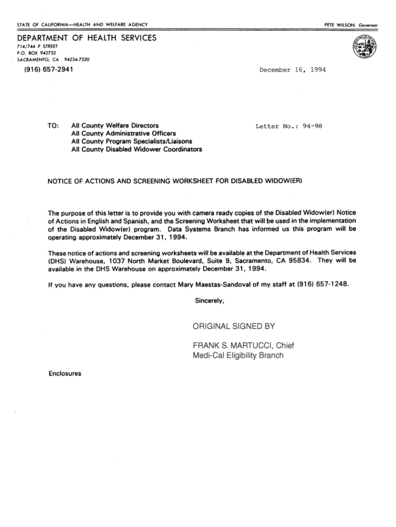 P.O. BOX 942732SACRAMENTO, CA942347320(916) 6572941TO:All All December 16, 1994County