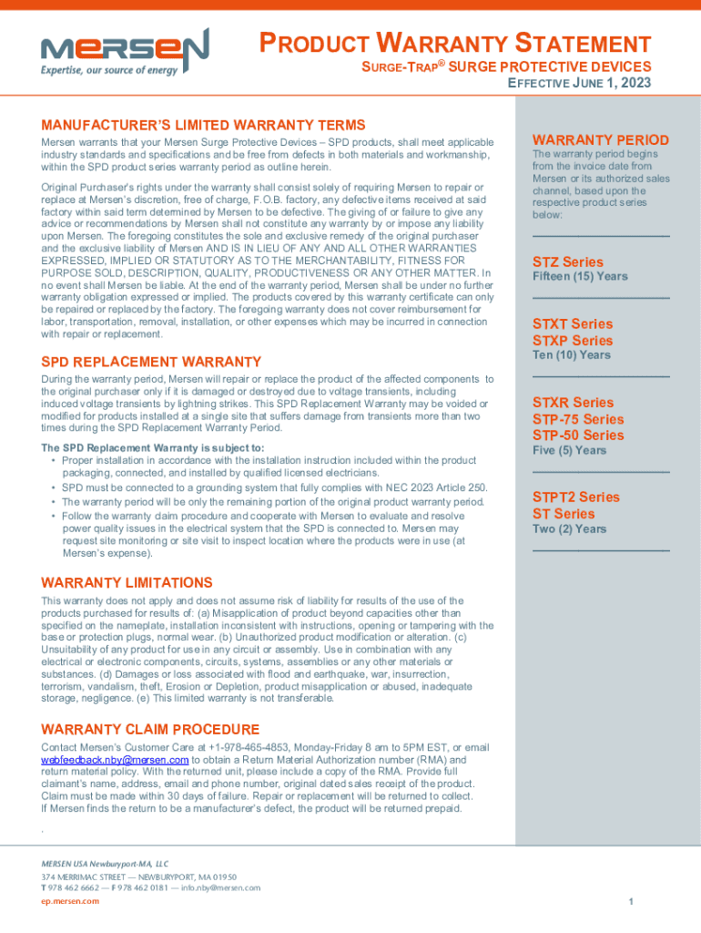 PRODUCT WARRANTY STATEMENTSURGETRAP SURGE PROTECTIVE DEVICES EFFECTIVE JUNE 1, 2023MANUFACTURERS LIMITED WARRANTY TERMS Mermen warrants that your Mermen Surge Protective Devices SPD products, shall