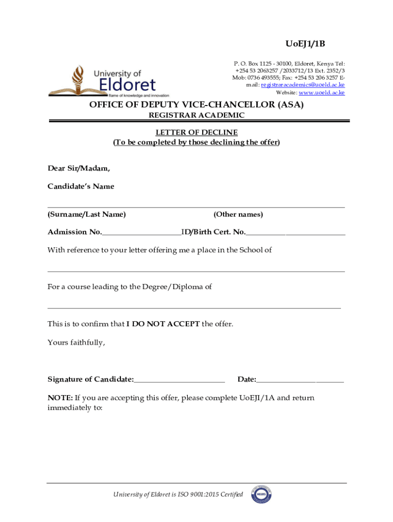 Mob: 0736 493555; Fax: +254 53 206 3257 Email: registraracademics@uoeld.ac.ke