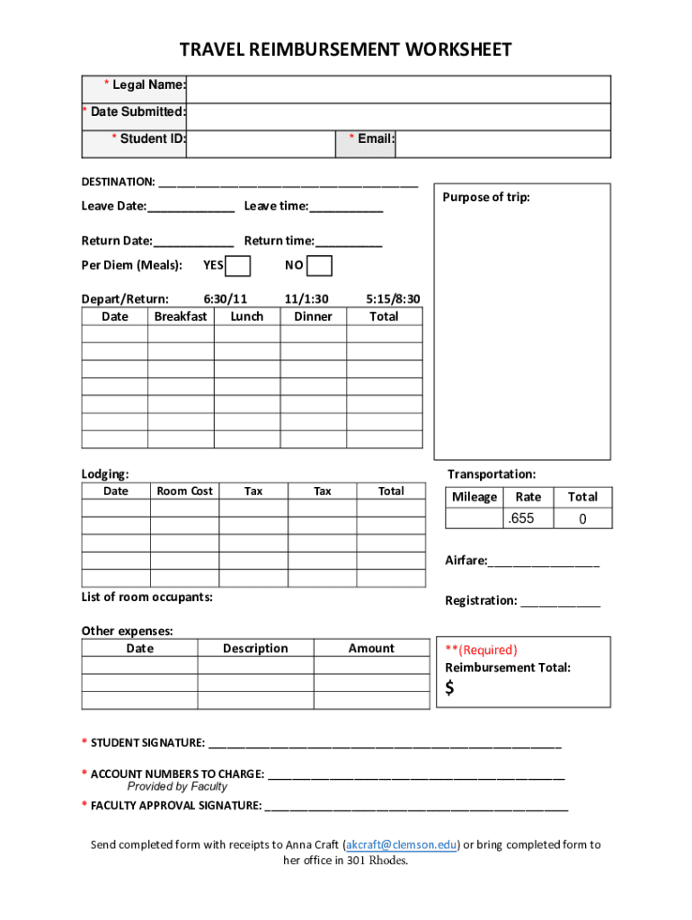 TRAVEL REIMBURSEMENT WORKSHEET * Legal Name: * Date Submitted: * Student ID:* Email:DESTINATION: ___Leave Date:___ Leave time:___Purpose of trip:Return Date:___ Return time:___ Per Diem (Meals):YESNODepart/Return: