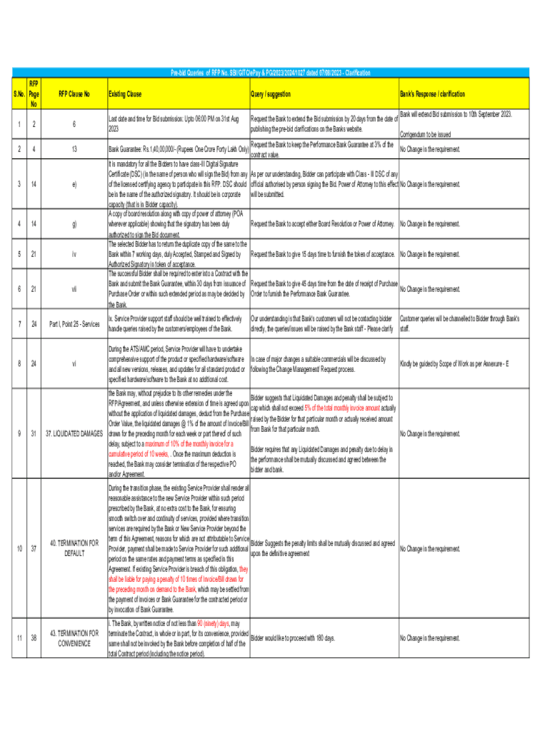Prebid Queries of RFP No. SBI/GITC/pay & PG/2023/2024/1027 dated 07/08/2023 Clarification RFP S. No. Page No RFP Clause Coexisting ClauseQuery / suggestion126Last date and time for Bid submission: