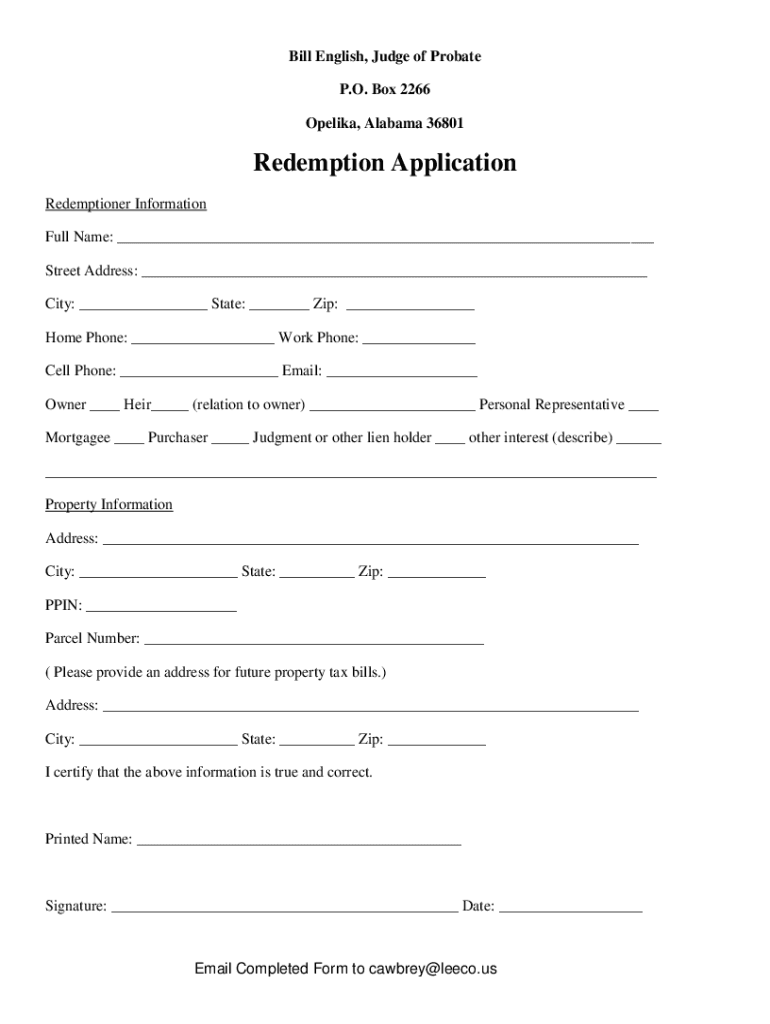 Bill English, Judge of Probate P.O. Box 2266 Ophelia, Alabama 36801Redemption Application Redemption her Information Full Name: ___ Street Address: ___ City: ___ State: ___ Zip: ___ Home Phone: ___