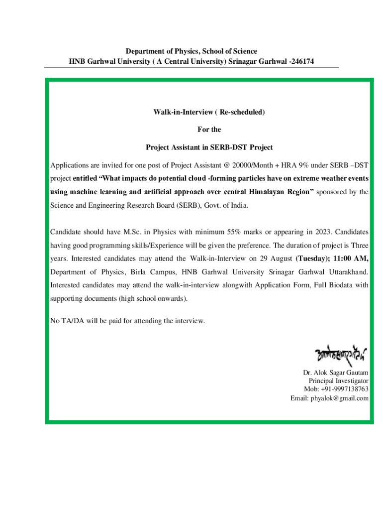 Department of Physics, School of Science HUB Narwhal University (A Central University) Srinagar Narwhal 246174WalkinInterview (Rescheduled) For the Project Assistant in SERBS Project Applications
