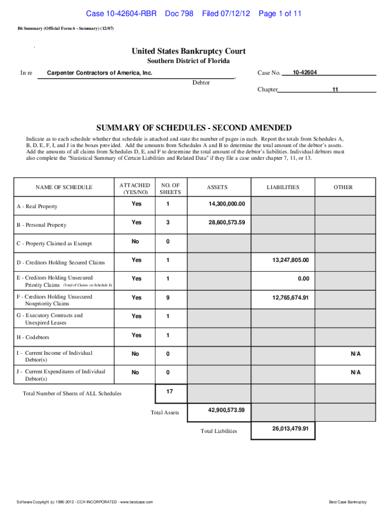 Case 1042604RBRDoc 798Filed 07/12/12Page 1 of 11B6 Summary (Official Form 6 Summary) (12/07) b k 1 F o r m 6. S u a y f c h e d ls United States Bankruptcy Court Southern District of Florida In reCarpenter