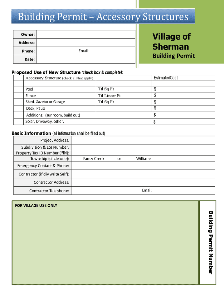Building Permit Accessory StructuresVillage of ShermanOwner: Address: Phone:Email:Building Permitted:Proposed Use of New Structure (check box & complete): Accessory Structure (check all that apply)