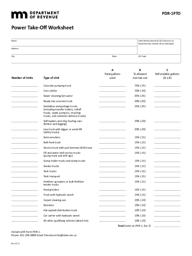 PDR1PTOPower TakeOff WorksheetEnter Minnesota tax ID (if a business) or Social Security number (if an individual)Headdress CityStateNumber of Mistype of Unit ZIP CodeATotal gallonsusedB% allowednontax