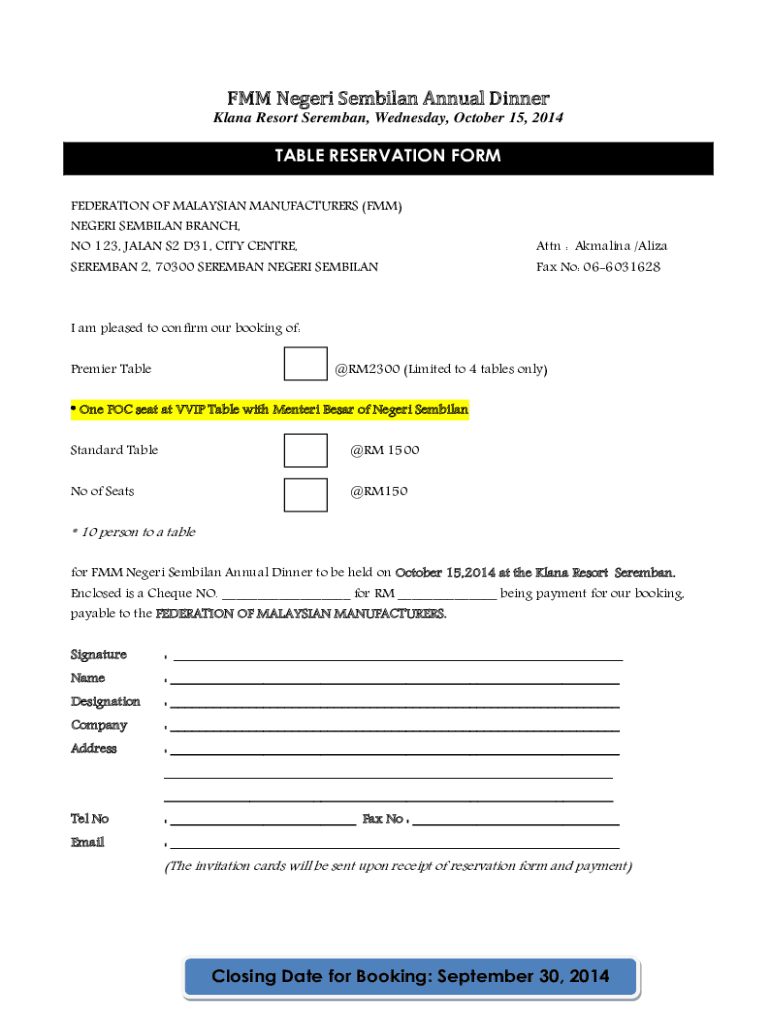 FMM Never Serbian Annual Dinner Klein Resort Seaman, Wednesday, October 15, 2014TABLE RESERVATION FORM FEDERATION OF MALAYSIAN MANUFACTURERS (FMM) NEVER SERBIAN BRANCH, NO 123, JAPAN S2 D31, CITY