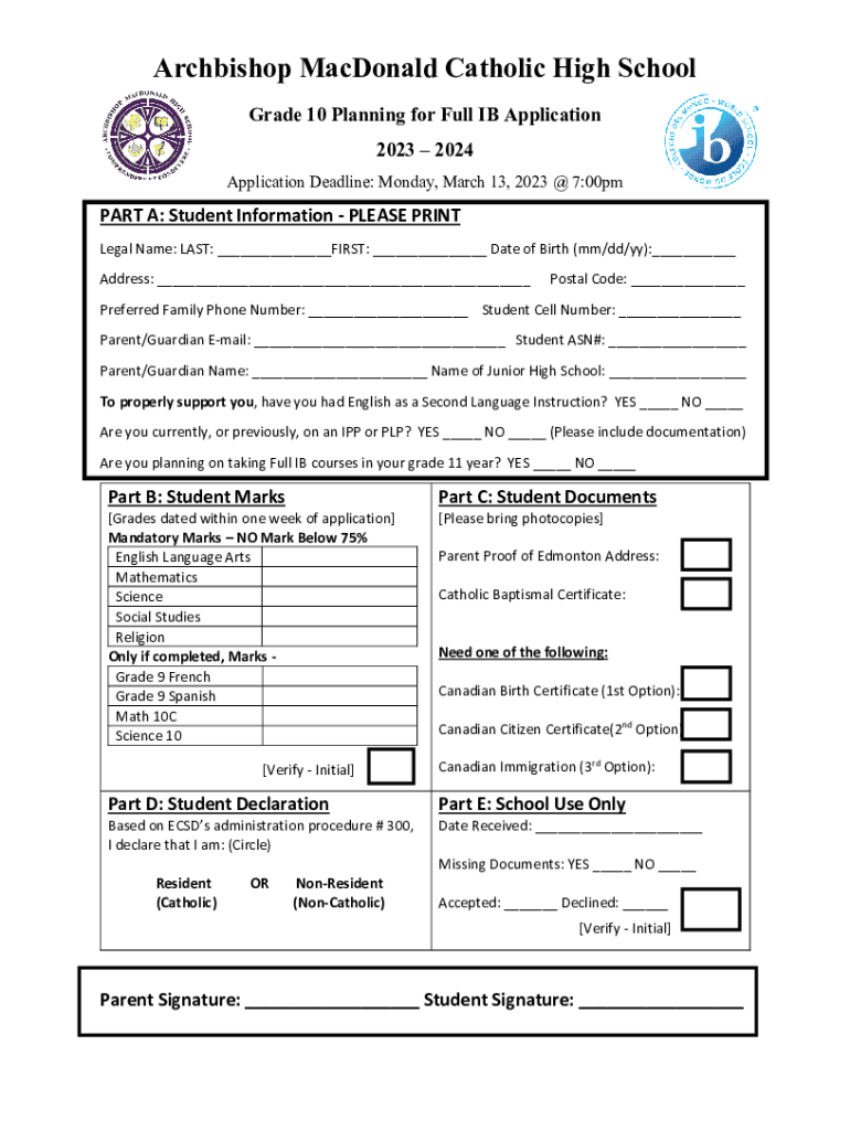 Archbishop MacDonald Catholic High School Grade 10 Planning for Full IB Application 2023 2024 Application Deadline: Monday, March 13, 2023 @ 7:00pmPART A: Student Information PLEASE PRINT Legal Name: