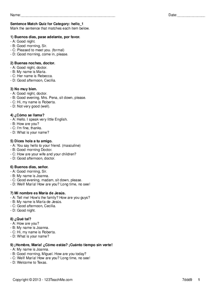 Name:___Date:___Sentence Match Quiz for Category: hello_1 Mark the sentence that matches each item below. 1) Burns was, base Adelaide, POR favor. A: Good night. B: Good morning, Sir. C: Pleased to